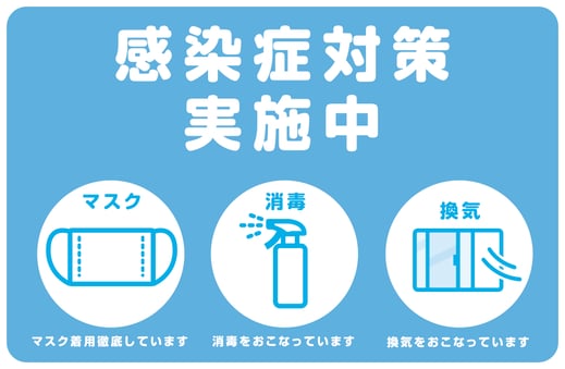 ※お客様ご自身での感染症対策(マスク着用、咳エチケット等)のご協力もお願いしております。また、換気機能付きエアコン及びストリーマ空気清浄機を設置しておりますが、強制換気のためドアや窓を開放する場合もございます。